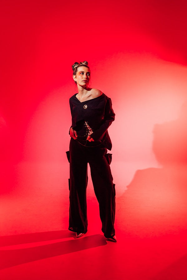 Fit | High waist close fit | Loose tapered leg | Open Pockets